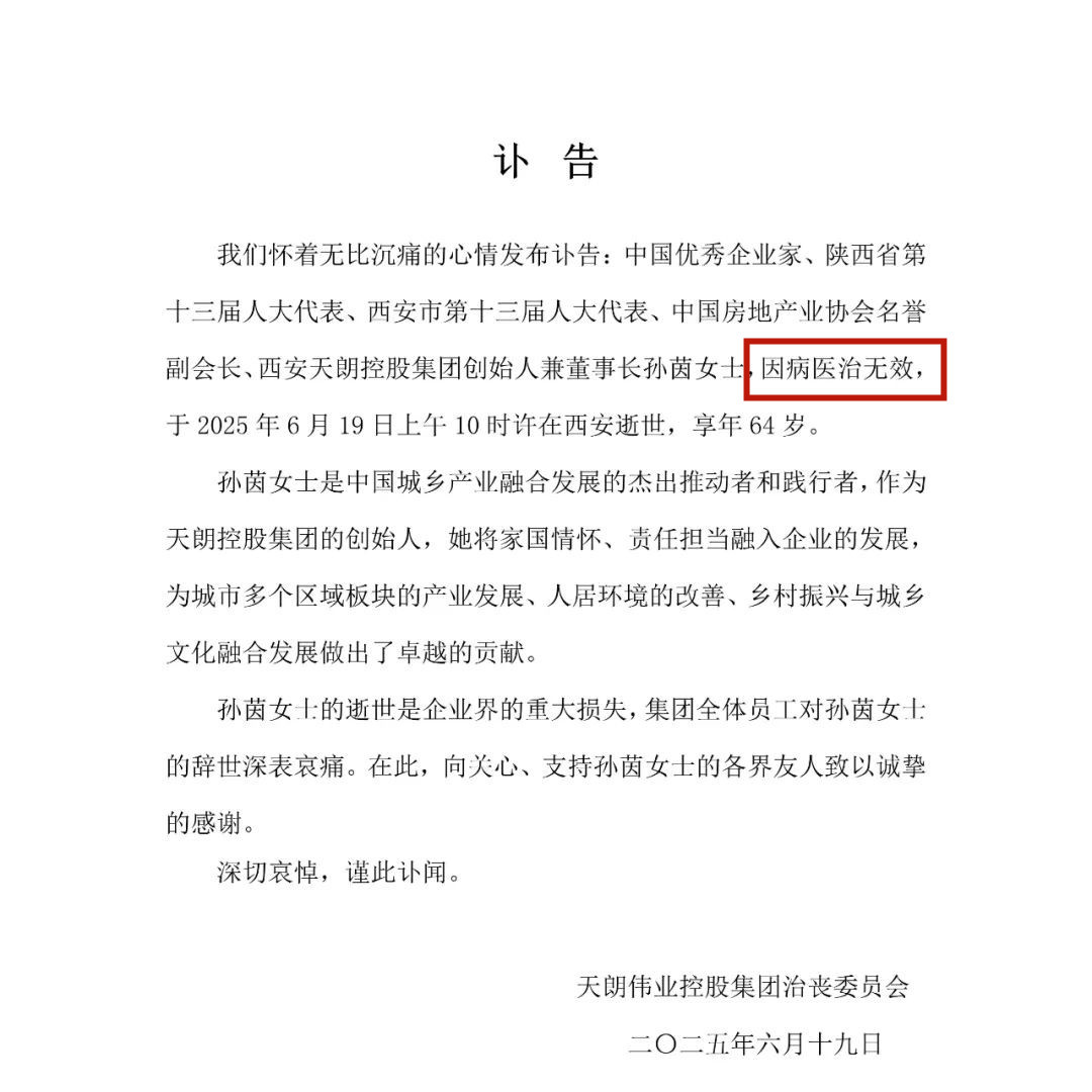 根据讣告可知,孙茵女士因病医治无效,于2025年6月19日上午10时在西安离世,享年64岁。